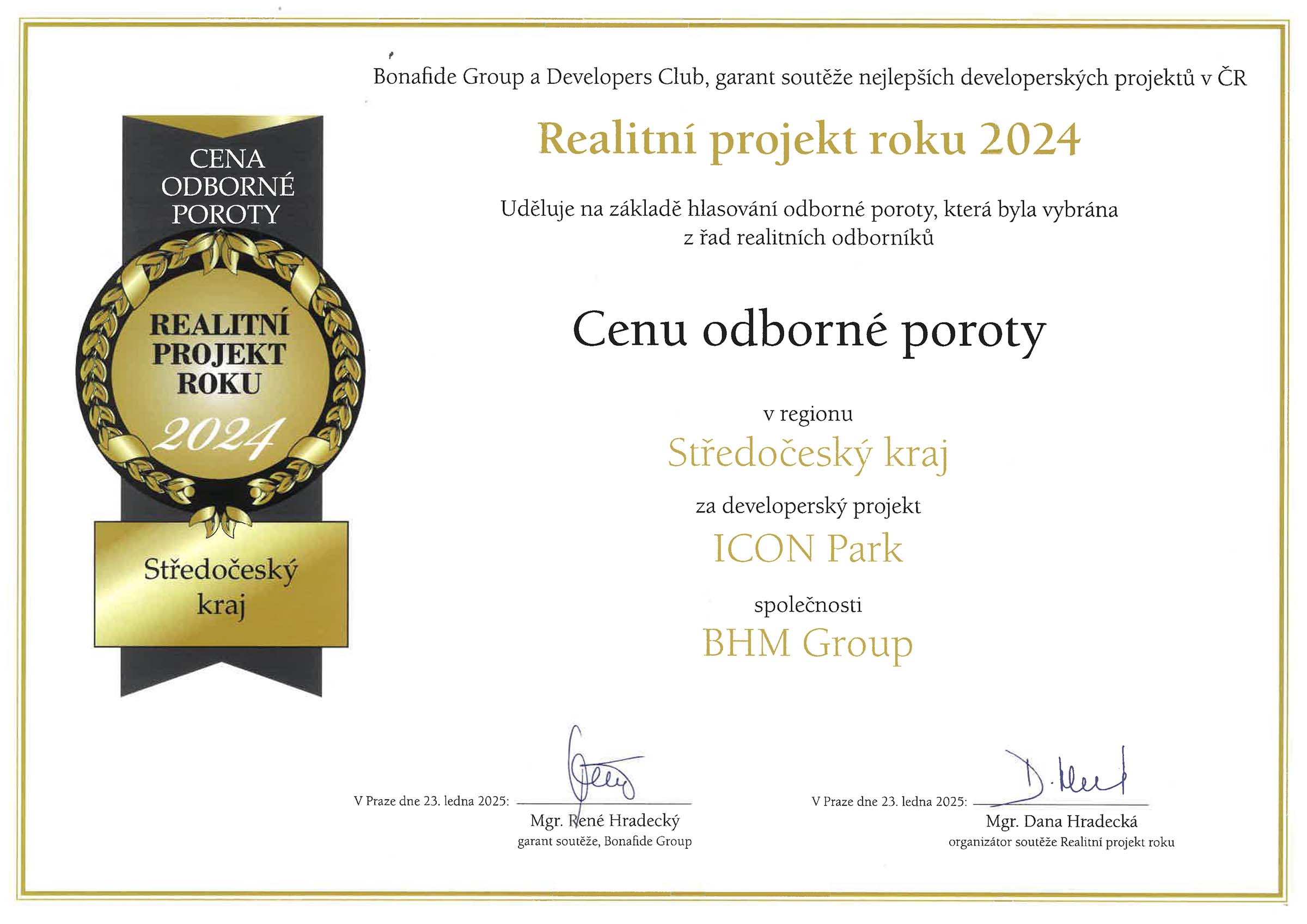 Praha, 24.01.2025 - Developerský projekt ICON Park, který realizuje společnost BHM group, získal prestižní Cenu odborné poroty za region Středočeský kraj v soutěži Realitní projekt roku 2024. Výsledky byly vyhlášeny na slavnostním galavečeru 23. ledna 2025.